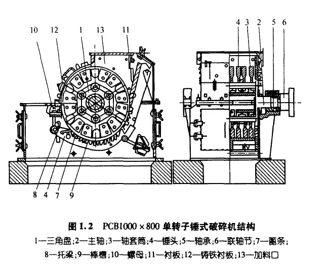 锤式破碎机按回转轴的轴数分类,有单转子和双转子两种型式;按转子回转方向分类,有可逆式和不可逆式之区别。锤式破碎机的捶 头结构和村质是决定产品质量和破碎效率的重要部件.为了延长锤头的使用寿命,一般在锤头的两端均开设安装孔,以便调头安装或正 反面调换使用。图1.2和图1.3分别为单转子和双转子锤式破碎机的结构原理图。双转子捶式破碎机设有‘v”形篦条,在一 对转子的上锤头之间构成了一个预破碎腔,大块物料在进入两回转轴形成的两个细碎腔之前,先进行预破碎,因此,这种破碎机具有破 碎比大、喂料均匀、兼有预碎和细碎两段破碎功能等特点,常被用作石灰石一段破碎系统。