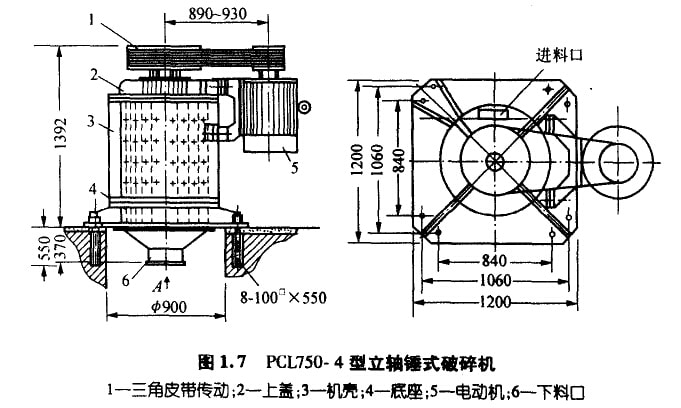 立轴捶式破碎机由上盖、机壳、立轴转子、底座和传动装置等部分组成(参见图1.7)。上盖一侧设有喂料口,机壳内装有反击板,中 心立轴转子对称布置有板锤或链锤,传动采用异步电动机和三角皮带,底座下部设有出料溜子。物料均匀喂入近料口,自由坠落过程中 被高速锤头锤击,物料在锤头与反击板之间又相互冲击,被粉碎物料由底部排出。