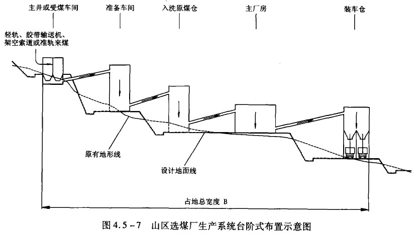 场地的地形、平面形状、面积、水文、工程地质、气象条件对工艺系统的布置影响极大。例如,在工程地质条件较好的平坦地区,工艺系统布置的限制较小,而在丘陵或山区,则牵制很大。总布置设计中必须注意到选煤厂工艺系统中几个主要车间的平距与垂高的上下起落关系,恰当地利用地形,既不要不顾具体自然条件,完全按固有概念去生搬硬套搞布置,也应避免布置仅仅是单纯地去迁就自然条件。前者必然造成工程、经济的不合理,并使总平面公式化;后者则会在生产上带来隐患,并使总平面布置杂乱无章。选煤厂几个主要车间一般应按顺序由高向低布置。当地形坡度较大时,工业场地往往呈台阶式布置,利用山坡自然落差,缩小房屋间距,从而减少占地面积和土石方工程量。山坡地布置生产系统的常见形式见图4.5-7。