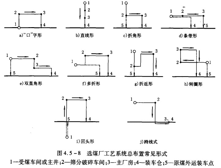 1)口字形:为矿区或群矿选煤厂最常见布置形式。系统清楚简明,环节少。适合于平坦地形无障碍地段、