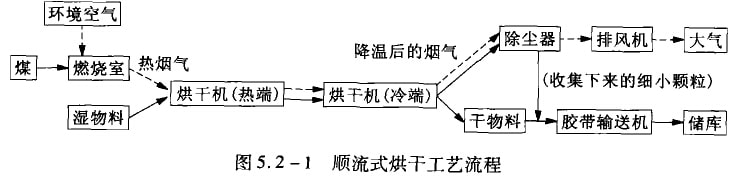 顺流式烘干工艺流程如图5.2-1所示。在顺流式烘干工艺流程中,物料运动方向与热烟气的流向是一致的。