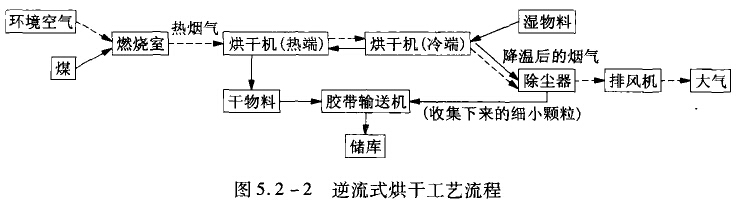 逆流式烘干工艺流程如图5.2-2所示。在逆流式烘干工艺流程中,物料运动方向与热烟气的流向是相反的。