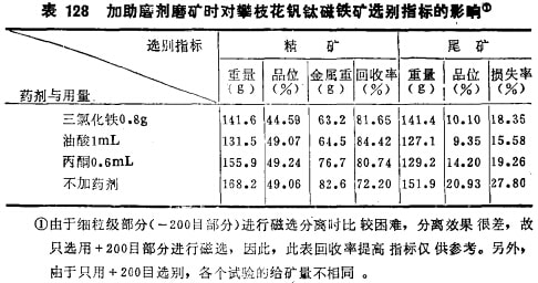 昆明工学院刘升明在用纯矿物混合物进行选择性磨矿研究的基础上,又进一步用实际铁矿石进行了验证硏究。实际铁矿石取自四川塔枝花铁矿密地选厂的细碎产品(粒度20-0mm),经破碎后取出5~3mm级别作试料;选择三氯化铁、油酸及丙酮为助磨剂;磨矿浓度为65%,磨矿时间20分钟。试验结果表明,三种助磨剂均有显著助磨效果,加药与不加药的磨碎结果差异显著,如-200目产率的绝对变化率增加7~12%,而相对变化率则增加20-34%,详见表127所示;磨碎产品进行磁选处理,得出精矿及尾矿,结果见表128所示。表128说明,加助磨剂后选别产品的精矿回收率有显著提高(这里只考查了+200目部分),而尾矿中的金属损失率大太降低。这也证明磨矿产生了显著的选择性解离,提髙了磨矿产品的单体解离度,所以尾矿中连生体少,金属损失少,尾矿品位低。