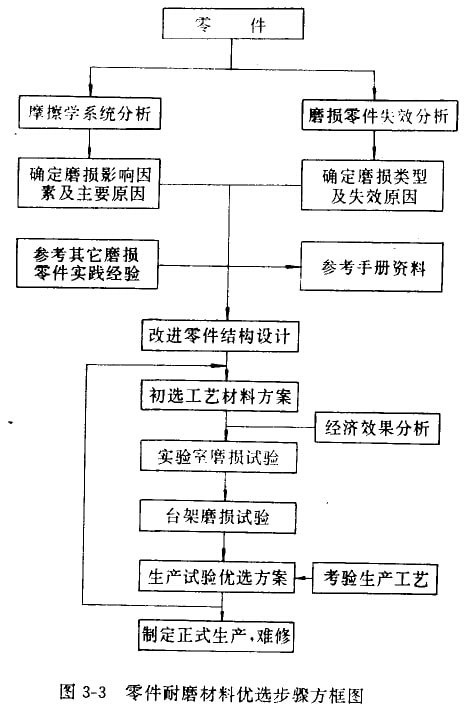 优选耐磨材料的基本方法和步骤可参考图3-3,即根据零件的实际使用条件,对零件的摩擦学系统进行系统分析,确定影响磨损零件的主要因素,再根据典型易磨损零件进行失效分桥,以确定磨损的主要类型;参考已有资料和手册初选材料及工艺,然后做模拟件磨损试验,筛选出较优方案后,再做台架试验、实际使用试验。将试验结果与原方案比较,反复试验判断其效果的再现性,然后估算其耐磨效果祁经济价值,经技术鉴定再转入中间或成批试验。再考核其应用在技术上的可能性和可靠性,最后制订出制造工艺规范和安装维护规定,才算完结。
