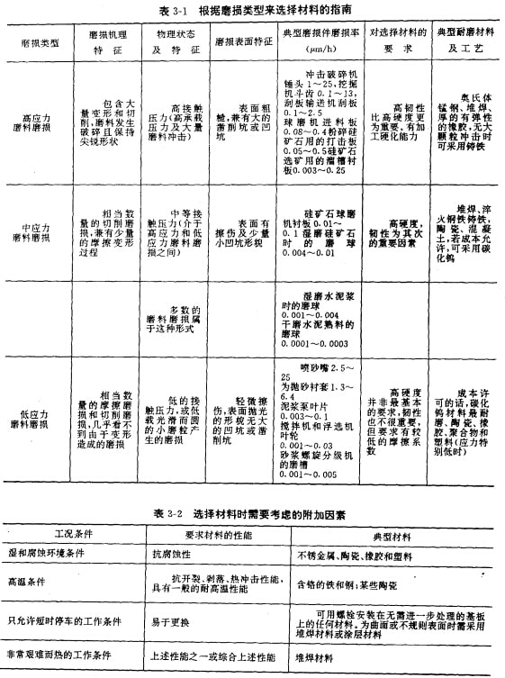 根据对零件磨损过程的系统分析以及典型零件的失效分析以后.我们对零件湃损原因,影响冈素及磨损类型、选材基本方向有了一定了解,下—步就要根据现有资料、知识相经验对材料和工艺进行方案初选。由于问题的复杂性,在材料和工艺选择上目前还停留在定性和感性认识的基础上,主要还是靠现有经验和反复试验来预测及判断的。表3-1为根据磨损类型来选择材料和工艺的指南,表3-2是选择材料和工艺时需考虑的附加因素。现今公布的资料尚不足以满足各个领域对材料和工艺优选需要,只是为选择材料和工艺时提供一些参考。