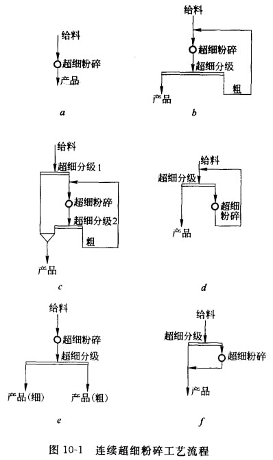 连续系统分为开路和闭路系统,其主要区别在于其是否有分级机配套形成闭路。图10-1所示为各种连续超细粉碎工艺流程。