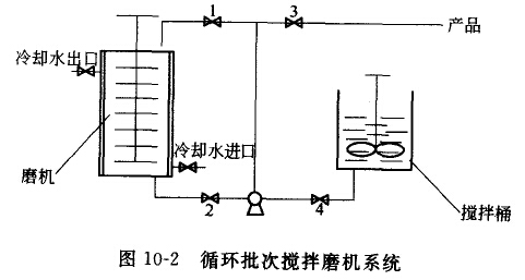 在湿式批次粉磨系统中,为避免泥浆粉磨时热量的聚集、粉碎环境的恶化,可采用循环式批次系统。即泥浆泵将研磨中的泥浆泵出,经冷却器冷却冉泵入磨机内,使磨机内温度降低,且强化了研磨中物料的混合,提高了产品粒度分布的均匀性。循环批次搅拌磨机如图10-2所示。