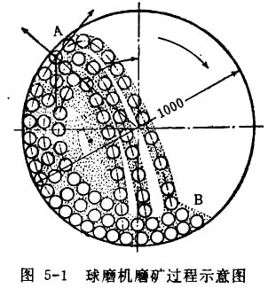 磨碎矿石通常是在磨矿机中进行的。磨矿机有各种不同的型式,仍在磨碎有色金属及黑色金属矿石时,目前我国只用球磨机和棒磨机。球磨机和棒磨机是一个两端具有空轴的回转圆筒,筒内装入相当数量的钢球或钢棒。矿石和水从一端的中空轴给入圆筒,从另一端的中空轴排山。当圆筒按规定的速度回转时,磨矿介质(钢球、钢棒)在筒内可作抛落运动和滑动,使矿石受到冲击和磨剥作用而被磨碎。磨碎了的矿石与水形成矿浆(湿式磨矿),由排矿端的中空轴排出。磨矿机磨矿过程中钢球的运动情况如图5-1所示。