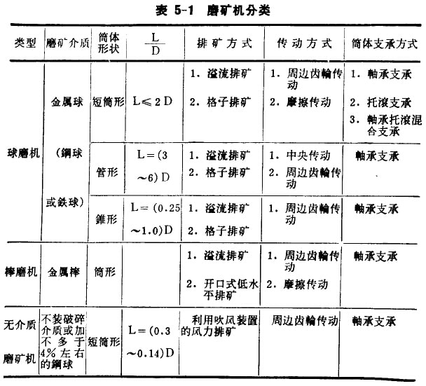 磨矿机通常根据磨碎介质、机壳形状和排矿方法进行分类。一般分类如表5-1所列。