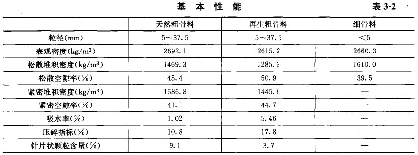 从表3-2可见,再生粗骨料中针片状颗粒含量为3.7%,天然粗月料的针片状颗粒含量为9.1%。骨料中的针片状颗粒不仅本身受力时易折断,而且含量较多时会增大骨料的空隙率,使混凝土拌羽吻和易性变差,同时降低混凝土强皮。因此,单就针片状颗粒含量来说,再生粗骨料优于天然粗骨料。