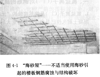 我国大规模经济建设的飞速发展,使沿海地区陆续出现河砂短缺现象。我国沿海地区愉挖、滥用海砂现象出来已久,1999年同土资源部发布了《关于加强海砂开采管理的通知》,提出在保护海洋环境的前提下,允许有序地开发海砂资源,以解决建筑用砂问题。这本是“变废为宝”的好事,然而,不合理地使用海砂,却会给国家和民众带来麻烦乃至灾难。这是因为海砂中含盐,会腐蚀钢筋、破坏混凝土结构。如果使用不合格海砂,建筑物就会发生结构破坏甚至跨塌(一般可在1-15年内暴露出来)。一旦遭遇地震,这样的建筑物可能最先倒塌。所谓“海砂屋”就是指使用了不合格海砂所建造的建筑物(公用、民用或基础设施),是属于质量低劣的建筑(图4-1)。