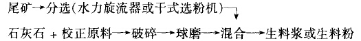 (3)生产。尾矿水泥与一般水泥的生产工艺基本相同。生料可采用球磨机混磨,但由于尾矿一般般已经过一定程度的磨细,为了节约能耗,亦可采用如下流程: