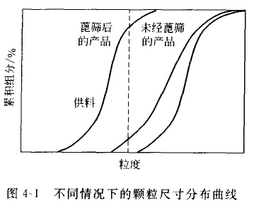 从图4-1中可以看出供料以及产品的顺粒尺寸分布曲线都是典型的“S”形。破碎过程中转无英筛以限创出料的最大尺寸,则一些具有最大尺寸部分的物料在尺寸并未减小的情况下通过破碎系统是完全订可能的。而从整体上讲,大部分颗粒的尺寸都减小了,这就使得该产品的PSD为一更宽的分布。如果系统中设有篦筛,则产品的PSD曲线明显左移。然而,由于原物料和破碎后的废物的形状不规则,一些大于篦筛开孔尺寸的颗粒,从对角位置或以一端向下的形式而透筛的情况时有发生,因此,篦筛产品的PSD曲线的一段要超过篦筛尺寸。