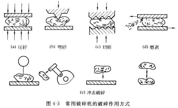 目前广泛采用的破碎方法有冲击破碎、剪切破碎、挤压破碎摩擦破碎等,此外还有专用的低温破碎、湿式破碎。常用破碎机的破碎作用方式如图4-3所示。