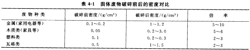 废物经锤式破碎机破碎以后,由于尺寸减小而密度增加。几种固体废物破碎前后的密度结果列于表4-1。从表中可见,破碎处理可使废物的密度增加2-10倍。