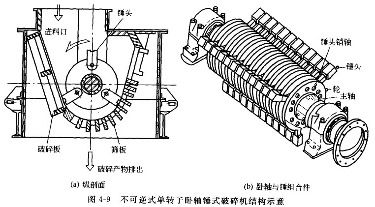 锤式破碎机包括卧轴锤式破碎机和立轴锤式破碎机两种,常见的是卧轴锤式破碎机,即水平锤式破碎机。水平轴由两端的轴承支持,原料借助重力或用输送机送入。转于下方装有篦条筛,篦条缝隙的大小决定破碎后的颗粒的大小。图4-9所不为不可逆式单转子卧轴锤式破碎机结构示意。
