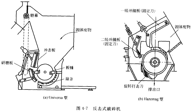 Hazemag型反击式破碎机装有两块反击板,形成两个破碎腔。转子上安有两个坚硬的板锤。机体内表面装有特殊钢衬板,用以保护机体不受损坏。这种破碎机主要用于破碎家具、电视机、杂器等生活废物。处理能力为50-60m3/h,碎块为30cm。也可用来破碎瓶类、罐头等不燃废物,处理能人15-90m3/h。对于破布、金属丝等废物可通过月牙形、齿状打击刀和冲击板间隙进行挤压和剪切破碎。