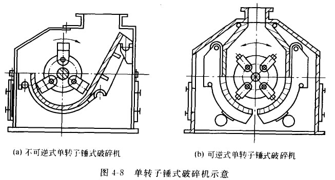 锤式破碎机主要由供料斗、丰机架、轴承、转子装置、破碎板和筛板组成。技转子数网可分为单转于锤式破碎机(只有一个转于)和双转子还式破碎机(合两个做相对运功回转的转于)两类。单转子锤式破碎机根据转子的转动方向又可分为可逆式(转于可两个力向转动)和不可逆式(转子只能一个方向转动)两种,图4-8(a)所示为不可逆式单转干锤式破碎机,图4-8(b)所示为可逆式单转子锤式破碎机。目前普遍采用可逆单转于锤式破碎机。可逆单转子锤式破碎机的转子首先向—个方向转动。该方向的衬板、筛板和锤子端部就受到磨损。磨损到一定程度后,转子改为另一个方向旋转,利用锤子的另一端从另一个方向的衬板相筛板继续工作,从续工作的寿命几乎提高一倍。
