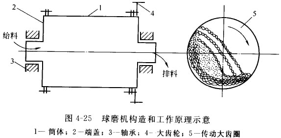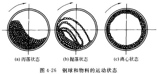 图4-25为球磨机构造和丁作原理示意。它由圆柱形筒体、筒体两端端盖、中空轴颈、轴承和传动大齿圈组成。在筒体内装有钢球(直径为25-150nml)。其装入量为筒体有效容积的25%-50%,筒体两端的中空袖颈有两个作用:一是应轴颈的支承作用,使球墨机全部重量由中空轴须传给轴承和机座;二是起给料和排料的漏斗作用,电动机通过联轴器和小齿轮带动大齿圈和筒体缓缓转动。筒体内壁设有衬板,仑同时起到防止筒体磨损和提升钢球的作用。当筒体转动时,钢球和破碎物料在摩擦力、离心人和衬板的共同作用下,被衬板带动提升。征在升到一定高度后,由于自身重力的作用处得钢球和物料产土自由泻路和抛落(图4-26),从而对筒体内底脚区的物料产个外击和研磨作用。物料粒径达到要求后出风机抽出。