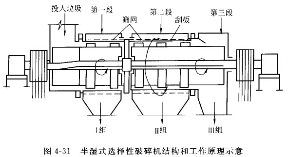 半湿式选择性破碎机是把破碎机械和筛分机械构成一体同时进行破碎、分选两个过程的一种机械装置。它由两种具有不同孔眼筛网的间转滚筒组成,滚筒内勺第一筛网和第二筛网分别对应安装有不同转速的利板。分选装置分为三段,第一、二两段装设筛网,第三段不设筛网。