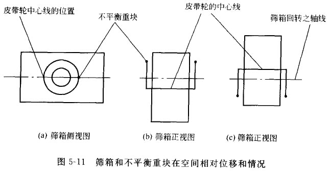 图5-10是WK型圆振动筛构造示意图。筛箱1利用弹簧吊链装置2悬吊起来,电动机3通过皮带传动装置4带动激振器轴5和不平衡重轮5回转,产生径向的力向变化的离心惯件力(激振力),驱动筛箱做圆形(或近似圆形)的振动,被筛物料受筛面向上运动的作用力被抛起,前进了一段距离后,再落回到筛面上。如此反复进行,并在从给科端向排料端运功的过程中完成筛分。振动筛的转数一般选择在远离共振区。即工作转数比共振转数大几倍。由于在远离共振区工作,所以振幅比较平稳,弹簧刚度小,弹簧软,而且激振力方向与筛箱振动方向相反。当不平衡重块转到上方[图5-11(b)]时,激振力向上,而筛箱向下;当不平衡重块转到下方[图5-11(c)]时,激振力向下,而筛箱向上。在筛箱的前、后方各设有水平弹簧,防止在启动或停机时,由于共振而产生强烈摇摆。由上述可知,简单惯性阅振功筛激振器的轴和皮带轮勺筛箱一起都参与振动,筛箱做振幅为A的圆振动,其轴和皮带轮在空间也做半径为A的圆振动。因此,皮带轮的小心线在生间的位置是变化的。