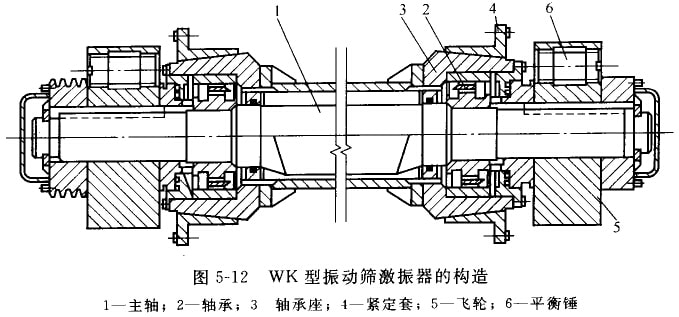 WK型圆振动筛激振器的构造如图5-12所示。在这种激振器中,产生振动的不平衡重量分别布置在轴1的中段和构端的飞轮5上。这样的结构,一方面可以减小轴的弯矩,同时也便改变激振器的激振力,达到调整筛于振幅的目的。铀1用一对双列向心球面滚子轴承装在轴承席3上,并通过紧定套4与筛箱连接。激振器的轴承,外侧采用迷宫式密封,内侧用毛毡密封,并用套筒将侗心轴封闭起来。