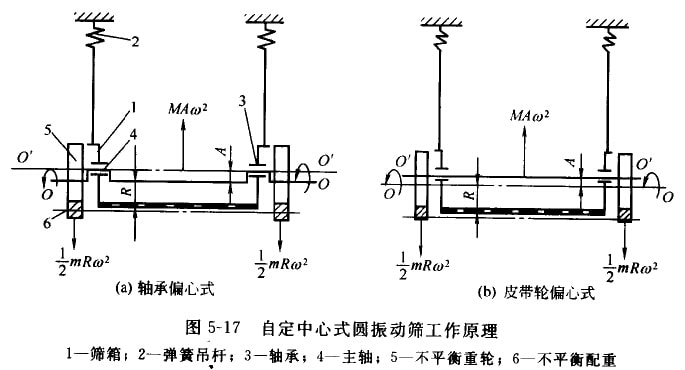 轴承偏心式自定中心圆振动筛的工作原理如图5-17(a)所示。筛箱1用四根弹簧吊杆2吊挂在机架或楼板上,该筛于的激振器主轴4是一根偏心轴,两端偏心部分(偏心距为r)通过轴承3与筛箱连接。侗心轴两端安有不平衡重轮5,重轮上固定有不平衡配重6。工作时,偏心轴和皮带轮均绕凹轴线转动,筛箱和不平衡重轮各自产生离心惯性力,两个离心惯性力的方向相反。如果根据筛箱的重量适当地确定不平衡重量,使两个离心力大小相等,偏心铀的偏心距r等于筛子的振幅A,若满足上述条件,就能使筛子在工作时的回转轴线OO(即皮带轮的中心线)固定不动,使筛箱在垂直平面上做圆形运动。