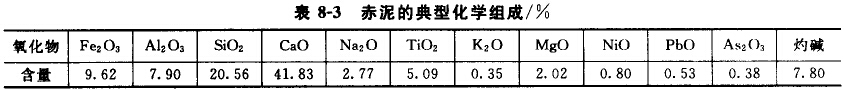 赤泥是制铝工业从铝上矿中提炼氧化铝后残留的一种红色、粉泥状、高含水量的强碱性固体废料,密度0.7-1.0t/m3,比表面积0.5-0.8m2/g。赤泥的组成和性质复杂,并随矿石成分、氧化铝生产工艺,及赤泥的脱水、陈化程度有所变化,其典型化学成分如表8-3所示。