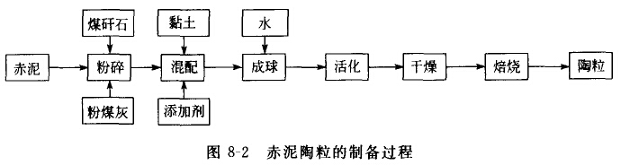 赤泥在建材工业中的其他用途还有:制备赤泥陶粒(工艺流程如图8-2所示)、生产玻璃、流态自硬砂硬化剂,用作塑料填充剂、防渗材料、铺路等,日前已有部分投人生产运营。但赤泥的使用量仍很低,这是由于赤泥中台有大量碱液,有的赤泥中尚含有U、Th、Sc、La、Y、Ta、Nb等放射性元素和稀有金后,如长期身处这类建材中,将直接危害人体健康。