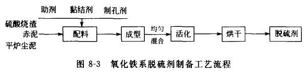 拜尔法赤泥中含有赤铁矿(α—Fe2O3)和针铁矿(α—FeOOH)、一水硬铝石(Al203·H2O)、含水硅铝酸钠(Na2O·Al2O3·1.73SiO2·1.73H2O)、方解石(CaCO2)等物相,经热处理后可形成多孔结构,比表面积可达40-70m2/g,因此,在硫化氢废气污染治理上,可利用其较佳的吸附性能,和硫酸烧渣、平炉尘等一道为主要原料(含员78%-88%)制备廉价的氧化系脱硫剂,其工艺流程如图8-3所示。