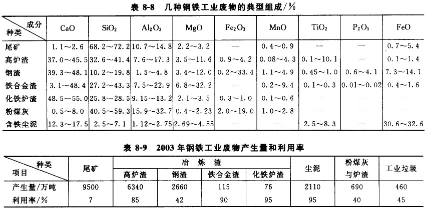 随着钢铁工业的蓬勃发展,近几年我国钢铁产量已稳居世界首位,2003年我国钢产量已达到2.2亿吨,接近世界总产量的20%;但同时也排放了约1.7亿吨的废物,包括开采废石、选矿尾矿、高炉渣、钢渣、铁合金渣、含铁尘泥、粉煤灰等,其典型组成如表8-8所示。