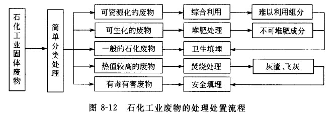 石化工业固体皮物的组成、性质不同,处理处置方式也有差异,如图8-12所示,经简单分类处理后,有综合利用价值的废物,如废催化剂、白土渣、吸附剂等,经各种方法回收有用物质后,方可进一步处理;有机物和水分含量较高的废物,如活性污泥、有机物残边等可先堆肥化处理,然后再进行无害化填埋处置;一般的工业废物,如滤布、包装材料、渣土等可直接进行卫生填埋处置;热值较高的废物,如泊泥、废低聚物、炼泊浮渣等可送去焚烧,产生的灰滔和飞灰,经同化处理后,应与有毒有害废物‘道进行安全填埋处理。