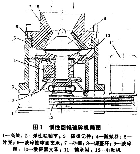 破碎机机体安装在隔振装置上。其工作机构由破碎链(内锥)9和外锥7组成,两个锥体工作面均镣有保护衬板,其表面形成—个逐渐向排矿方向收缩的破碎腔。在破碎链抽上通过轴承装有不平衡激振器4。电动机通过三角皮带传动系统和挠性联抽节来带动激振器旋转。当激振器旋转时产生离心力,迫使支承在球面文承上的破碎锥绕球心摆动。如果破碎腔内没有被破碎的物料,破碎锥沿外锥的内表面无间隙地滚动;如果破碎腔内有物料,则通过物料层波动,在滚动的同时,随物科层厚度变化伴随有冲击,从而对物料进行破碎。破碎产品从排料口排出,排料口的大小可以通过调整环来调节。