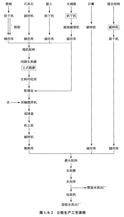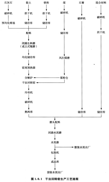 水泥生产工艺流程有干法回转窑生产工艺流程、湿法回转窑生产工艺流程和立窑生产工艺流程等。于法回转窑生产工艺流程见图1.0.1,立窑生产丁艺流程见图1.0.2。