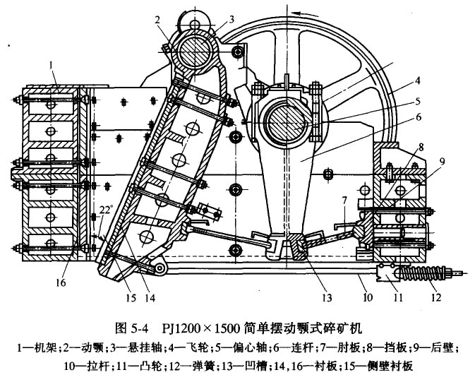 颚式碎矿机可动额板的运动是借助偏心连杆和推力板来实现的,它是由飞轮4、偏心轴5、连杆6、前推力板和后推力板7(俗称肘板)组成。两个飞轮分别装在偏心铀的两端。偏心釉支承在机架侧壁上的轴承中。连杆上部装在偏心轴上,前、后推力板的一端分别支承在连杆下部两侧的推力板支座的凹槽13上,前推力板的另 端支承在动颚下部的推力板支座中,后推力板的另一端支承在机架后壁的推力板支座中。当电动机通过皮带轮带动偏心轴旋转时,使连杆作上下运动,从而带动推力板运动,使前、后两推力板所形成的夹角不断改变推动动颚运动。使可动颚板围绕悬挂轴3作往复摆动,从而破碎矿石。当动颗向前摆动时,水平拉杆10通过弹簧12来平衡动颚和推力板所产生的惯性力,使动领和推力板紧密结合,不致分离。当动额后退时,弹簧又可起协助作用。