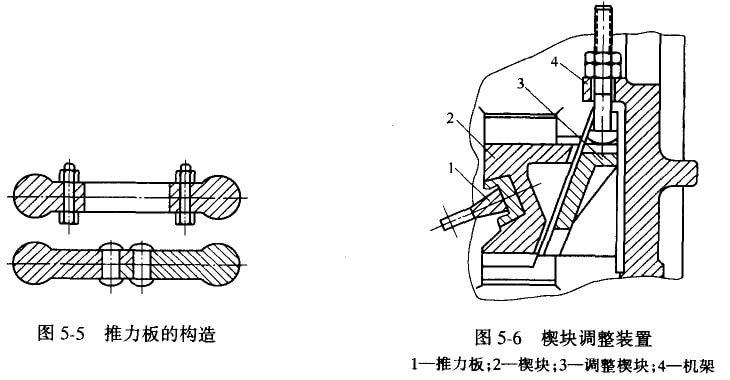 (1)楔块调整装置。如图5-6所示,它是用放在后椎力板座与机架后壁问的两个楔块2和3来调整。使调整楔块3沿机架后壁L升和下降,即可将排矿口减小和增大。用此法调整排矿口的大小,可以达到无级调整,方便省力,且可不必停车。但缺点是使机架的尺寸和质量增大,且不易调乎,故使推力板和连杆受力不均,所以这种装置,只适用于中、小型碎矿机。