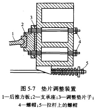 (2)垫片调整装置。如图5-7所示,在后推力板1的支承座2后面放入一组厚度相同的垫片3,改变垫片的数量,即可达到调整徘矿口大小的目的。在调整排矿口时,要先特螺帽4及拉杆弹簧螺帽5松开,然后增加或减少垫片的数目,待排矿口调整好后,再将螺帽4上紧,并调整弹簧上的螺帽5。用此法可以达到多级调整,调整时也比较方便,同时可以使机器结构紧凑和质量减小。但调整时必须停车。这种方法常用在大、中型碎矿机上。