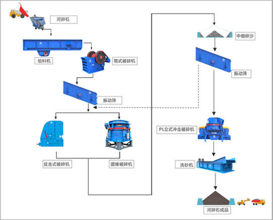 玄武岩大块物料经料仓由振动给料机均匀喂料,输送到颚式破碎机进行粗碎,粗碎后的物料经振动筛筛分后,由皮带输送机输送至反击式破碎机或圆锥破碎机进行中细碎。