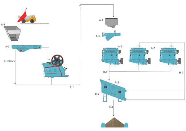 通常破碎流程主要分为两级破碎,先由颚式破碎机将原矿石破碎成小块儿矿石,然后送进圆锥破碎机,将小块儿矿石破碎成0-10mm的小颗粒。