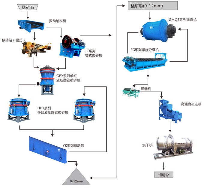 大块的锰矿石经料仓由振动给料机均匀地送进颚式破碎机或移动颚式破碎站进行粗碎;粗碎后的锰矿石经过振动筛筛分后,由皮带输送机送到单缸液压圆锥式破碎机进行中碎;中碎后的锰矿石物料送入多缸液压圆锥式破碎机进行细碎;