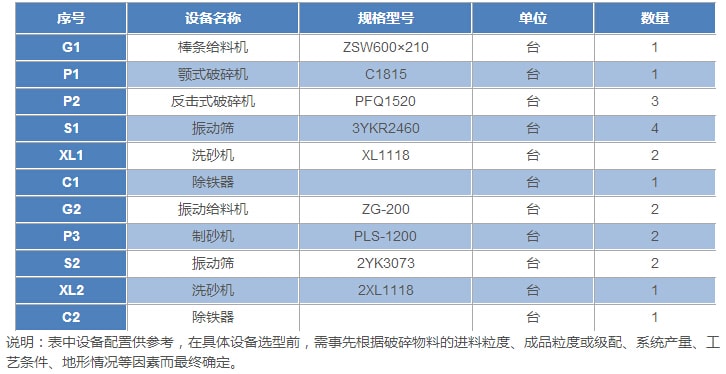 1000t/h---石灰石(白云岩)类岩石的砂石骨料生产工艺设备配置表