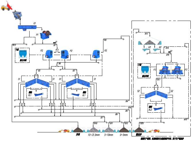 该生产线生产工艺主要适用于1000t/h石灰石(白云岩)类中等以下硬度物料的加工破碎,将经过爆破处理或开挖洞采的毛料通过棒条给料机均匀的供给颚式破碎机破碎,经颚式破碎机破碎后的半成品物料通过皮带机输送给反击式破碎机进行二次破碎,经反击破二次破碎后的混合骨料经过皮带机输送至一筛车间进行分级筛分,筛分过后将大于用户需要的大颗粒物料通过皮带机输送至细碎反击式破碎机再进行破碎,破碎后的物料再通过皮带机也输送至一筛车间进行筛分,筛分过后的不同颗粒级别的成品通过成品出料皮带机输送至成品料仓。不符合要求的大颗粒再次返回细碎反击式破碎机进行循环破碎。如果成品砂需要水洗也可以配置洗砂机用于成品砂的水洗,该系统的棒条给料机还具有预筛分功能,可以将原料中的细颗粒物料提前分离直接进入后续的破碎设备,也可将原料中的泥土杂物作为弃料预先分离。