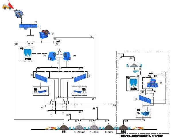 根据工程的需要,该系统也可以配置制砂系统,用于生产合理级配的精品砂(如虚线框内所示),当需要生产精品砂时,可以从一筛筛分车间筛分后分离出5-40mm的混合物料通过皮带机输送至制砂车间的半成品料仓,再通过振动给料机将物料均匀的给至制砂机,经过制砂机破碎后的成品混合料再通过皮带输送机输送至二筛筛分车间进行筛分,从而分离出不同颗粒级别的成品。