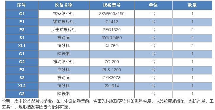 500t/h---石灰石(白云岩)类岩石的砂石骨料生产工艺设备配置表