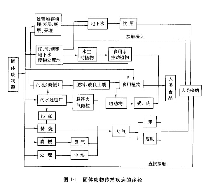 固体废物特别是有害固体废物,如处理、处置不当,具中的有毒有害物质如化学物质、病源微生物等可以通过外境介质一大气、土壤、地庆或地下水体进人生态系统形成化学物质型污染和病原体型污染,对人体产牛危害,同时破坏个态环境,导致不可逆生态变化。其具体途径取决于固体废物本身的物理、化学和生物性质,而凰与固体废物处置所在场地的水质、水文条件有关,如:有些可通过燕发直接进入大气;但更多通过接触浸入、食用或咽入受污染的饮用水或食物进入人体。固体废物传播疾病的途径见图1—1。