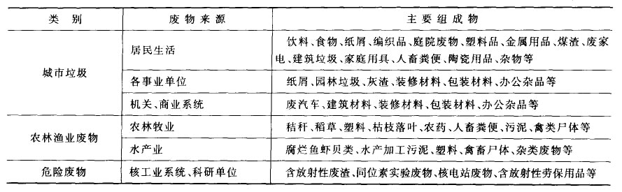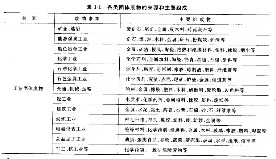 我国的工业固体废弃物主要来自各个工业部门的个产环行和生产废弃物,由于工业同体废弃物常常具有毒性,破坏整个生态系统并对人体健康产生危害,因而越来越引起人们的重视,其中很多废物划人危险废弃物一类进行涅慎处理。按行业可分为以下几类:矿业、选冶,能源煤炭工业,黑色冶金工业,化学工业,石油化学丁业,有色金属工业,交通、机械、运输,轻工业,建筑业,纺纠工业,电器仪表业,食品加工业,军工、核工业等。表1—1中列举了各类固体废物的来源利主要组成。