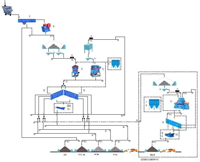 该系统示意工艺适用于时产400吨花岗岩、玄武岩类硬性物料的加工破碎,将经过爆破处理或开挖、洞采的大块毛料通过自卸车上料至原料仓,经过具有预筛分功能的棒条给料机均匀的供给颚式破碎机破碎,经颚式破碎机破碎后的半成品物料通过皮带机输送给具有中细碎功能的圆锥破碎机进行二次破碎,经圆锥破碎机二次破碎后的混合成品骨料经过皮带机输送至后续一筛车间进行分级筛分,筛分将大于用户需要的大颗粒物料再通过皮带机输送至细碎圆锥破碎机进行破碎,破碎后的物料也进入一筛车间进行筛分,满足客户需要的合格成品通过皮带机输送至成品料仓,不符合要求的大颗粒再次返回细碎圆锥破碎机进行循环破碎。如果成品砂需要水洗也可在一筛下面配置洗砂机用于成品砂的水洗。该系统的棒条给料机还具有预筛分功能,可以将原料中的细颗粒物料提前分离直接进入后续的破碎设备,也可将原料中的泥土杂物作为弃料预先分离。