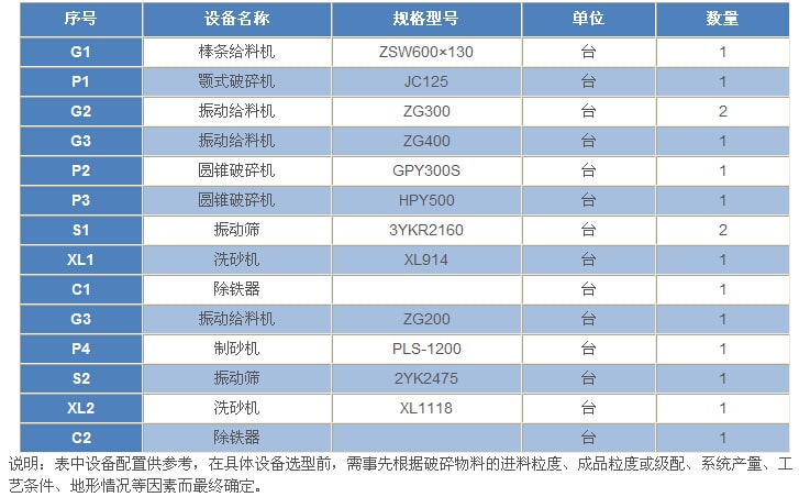 400t/h---花岗岩(玄武岩)类岩石的砂石骨料生产工艺设备配置表