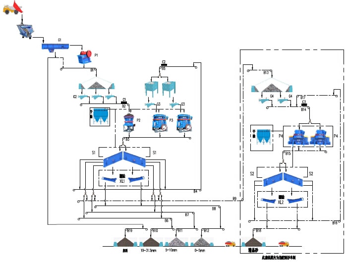 该系统示意工艺适用于时产800吨花岗岩、玄武岩类硬性物料的加工破碎,将经过爆破处理或开挖、洞采的大块毛料通过自卸车上 料至原料仓,经过具有预筛分功能的棒条给料机均匀的供给颚式破碎机破碎,经颚式破碎机破碎后的半成品物料通过皮带机输送给具 有中细碎功能的圆锥破碎机进行二次破碎,经圆锥破碎机二次破碎后的混合成品骨料经过皮带机输送至后续一筛车间进行分级筛分, 筛分将大于用户需要的大颗粒物料再通过皮带机输送至细碎圆锥破碎机进行破碎,破碎后的物料也进入一筛车间进行筛分,满足客户 需要的合格成品通过皮带机输送至成品料仓,不符合要求的大颗粒再次返回细碎圆锥破碎机进行循环破碎。如果成品砂需要水洗也可 在一筛下面配置洗砂机用于成品砂的水洗。该系统的棒条给料机还具有预筛分功能,可以将原料中的细颗粒物料提前分离直接进入后 续的破碎设备,也可将原料中的泥土杂物作为弃料预先分离。