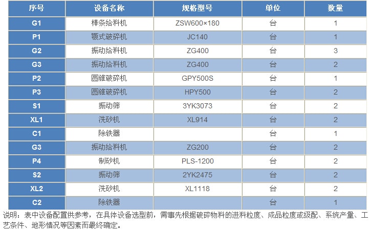 800t/h---花岗岩(玄武岩)类岩石的砂石骨料生产工艺设备配置表